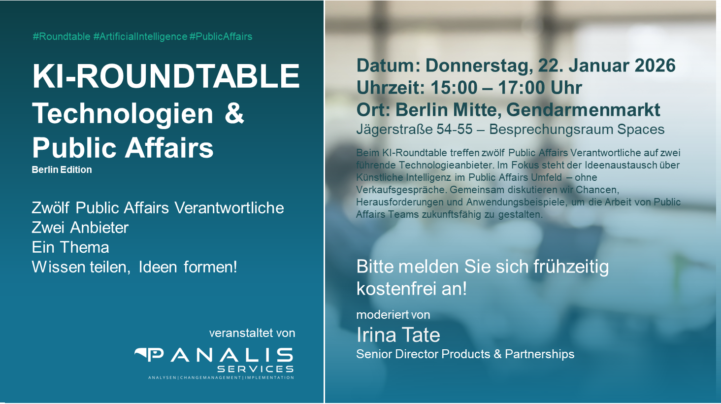 • Nehmen Sie teil am ersten KI-Roundtable für Public Affairs in Berlin.