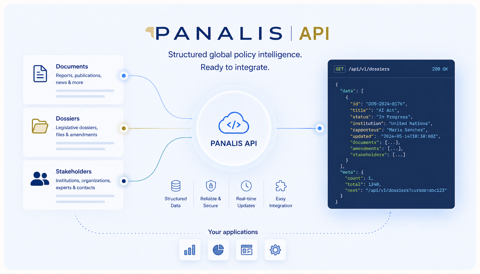 The PANALIS API provides seamless access to one of the world’s largest public affairs intelligence databases, delivering structured, real-time data on policy, legislation, and stakeholders across the globe.
